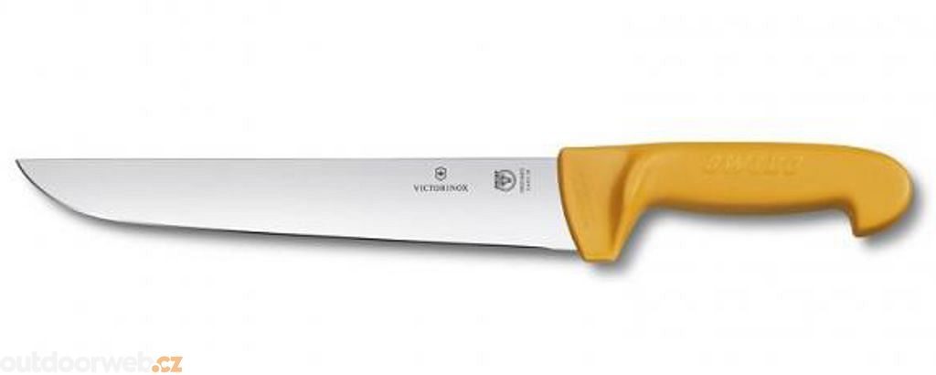 Řeznický nůž z kolekce Swibo od značky Victorinox. Má 24cm dlouhou čepel a žlutou ergonomickou rukojeť z polypropylénu.