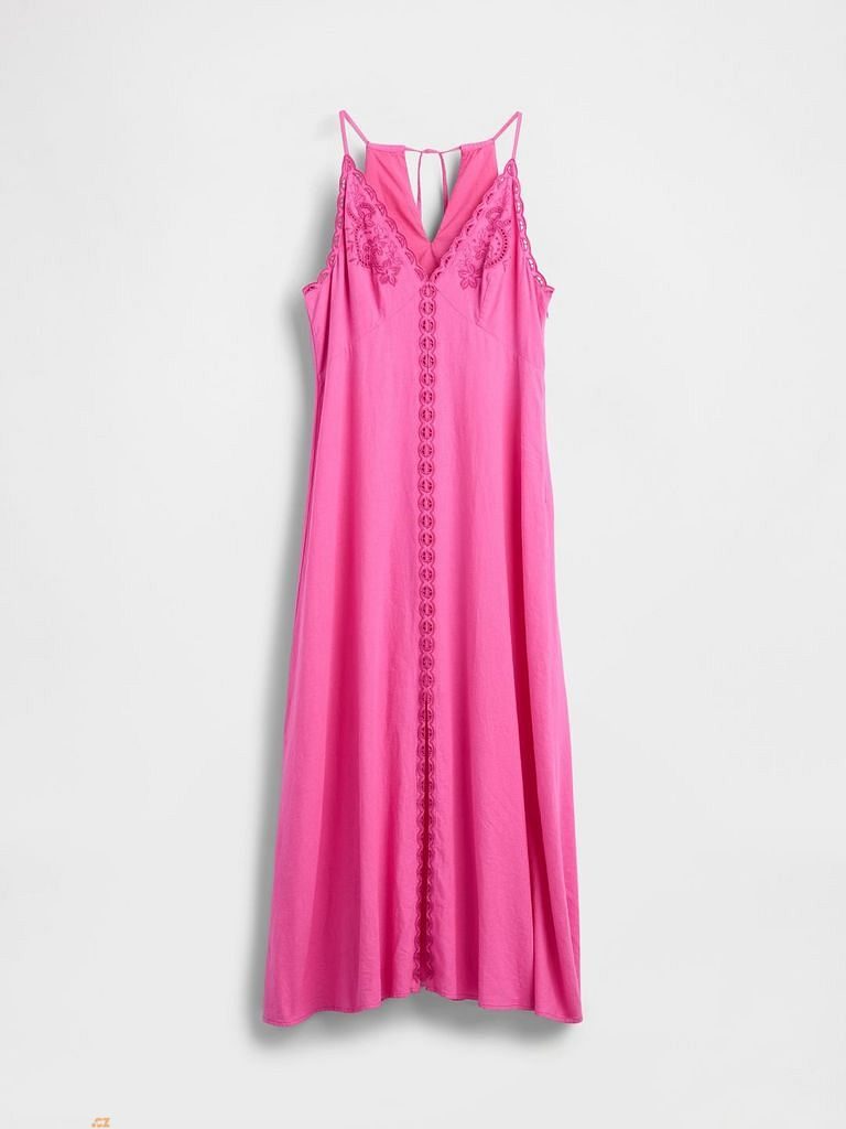 Dámské maxi šaty z lněné směsi s výšivkou a halter výstřihem spojují letní lehkost s jemnou elegancí – ideální volba pro slunečné dny, zahradní slavnosti i večerní události.