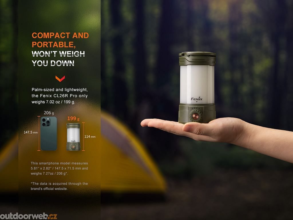 Fenix CL26R PRO je praktická přenosná nabíjecí lucerna, kterou můžete použít pro osvětlení místnosti, stanu, tábořiště, karavanu, chaty, lodě či pracovního stolu. Navíc disponuje i funkcí powerbanky, takže ji lze využít pro dobíjení jiných USB zařízení. Lucerna nabízí funkci kruhového svícení a spodní svícení, jednotlivé světelné režimy se přepínají otočným ovladačem. Oba způsoby svícení lze navíc kombinovat a dosáhnout tak celkového výkonu až 650 lumenů.