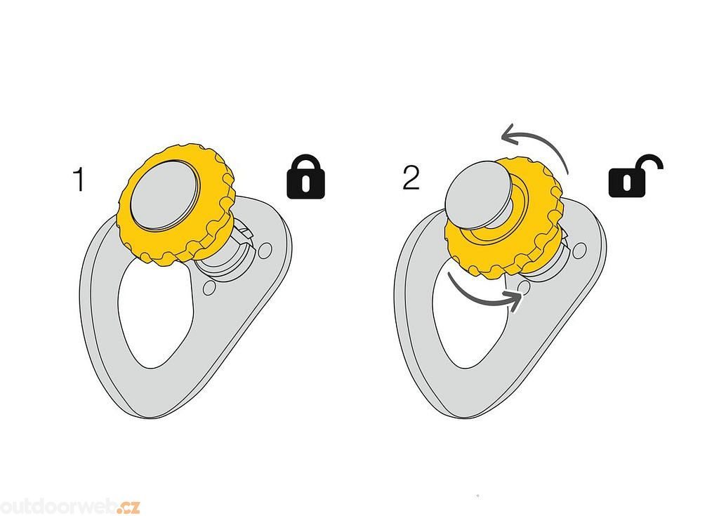 - Široký a ergonomicky tvarovaný otvor pro připojení karabin zjednodušuje jejich zapínání a umožňuje připojení dvou karabin najednou.