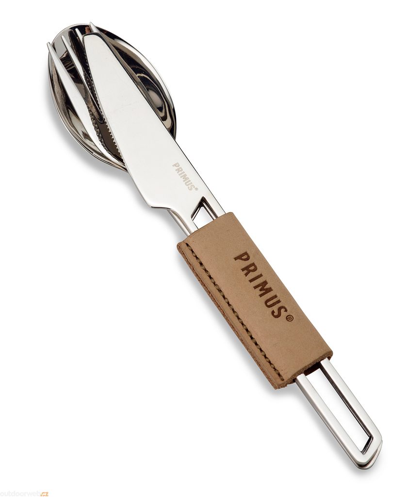 Sada příborů sestávající z nože, vidličky a lžíce z nerezové oceli 18/8. Jednotlivé kusy jsou bezpečně uchyceny v koženém pouzdře.