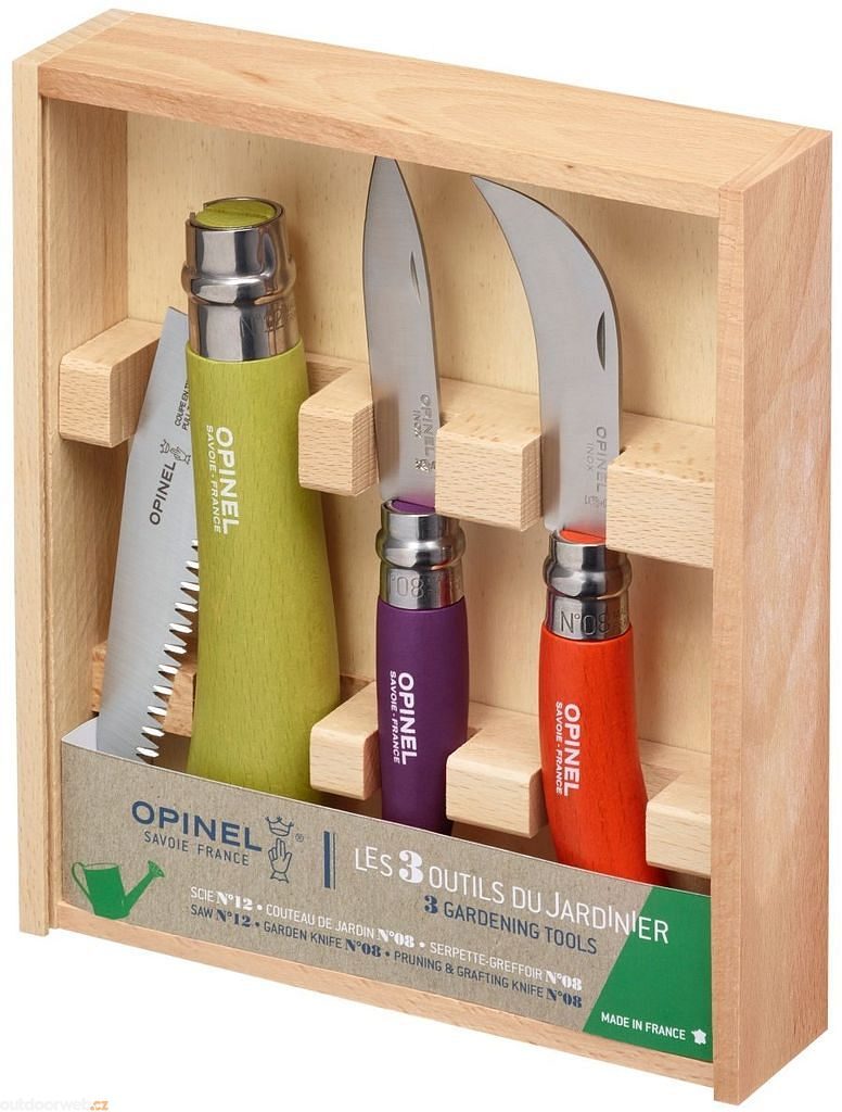 Tato sada zahradních nožů od značky Opinel obsahuje 1 pilový nůž N °12 jablko zelená rukojeť, 1 zahradní nůž N °08 fialová rukojeť, 1 prořezávací nůž N °08 rukojeť oranžová. Tento set je ideálním společníkem pro zahradní práce.
