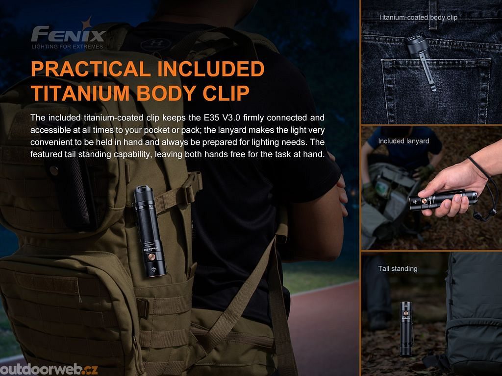 Třetí generace LED svítilny Fenix E35 V3.0 nabízí světelný tok až 3000 lumenů (ANSI) a dosvit až 240 metrů. Výborného výkonu bylo dosaženo použitím moderní LED Luminus SST-70. K napájení slouží vysokokapacitní Li-ion akumulátor typu 21700 s kapacitou 5000 mAh a zabudovaným nabíjecím USB-C konektorem (akumulátor je součástí balení). Svítilna byla navržena s ohledem na jednoduchost ovládání a širokou použitelnost.