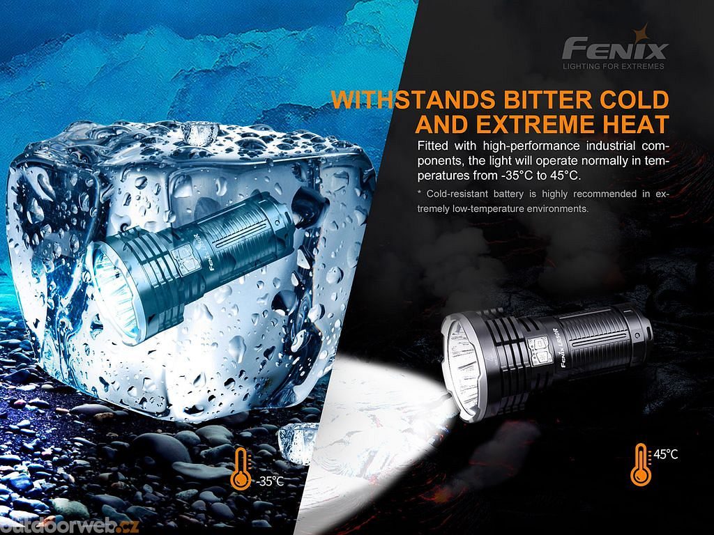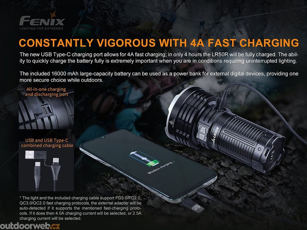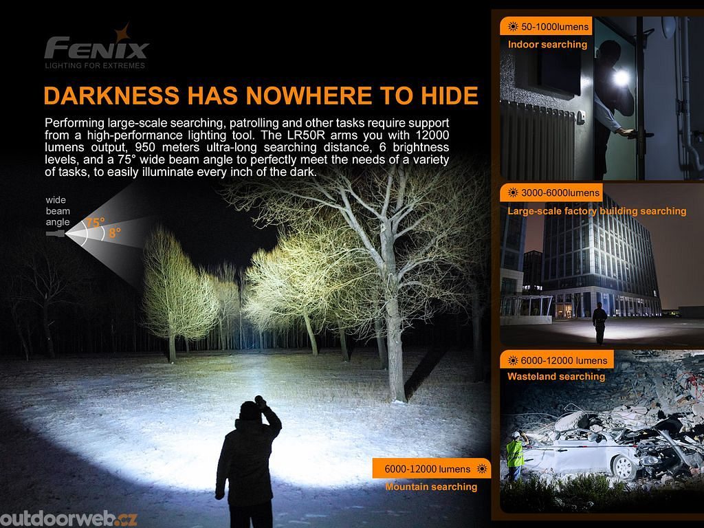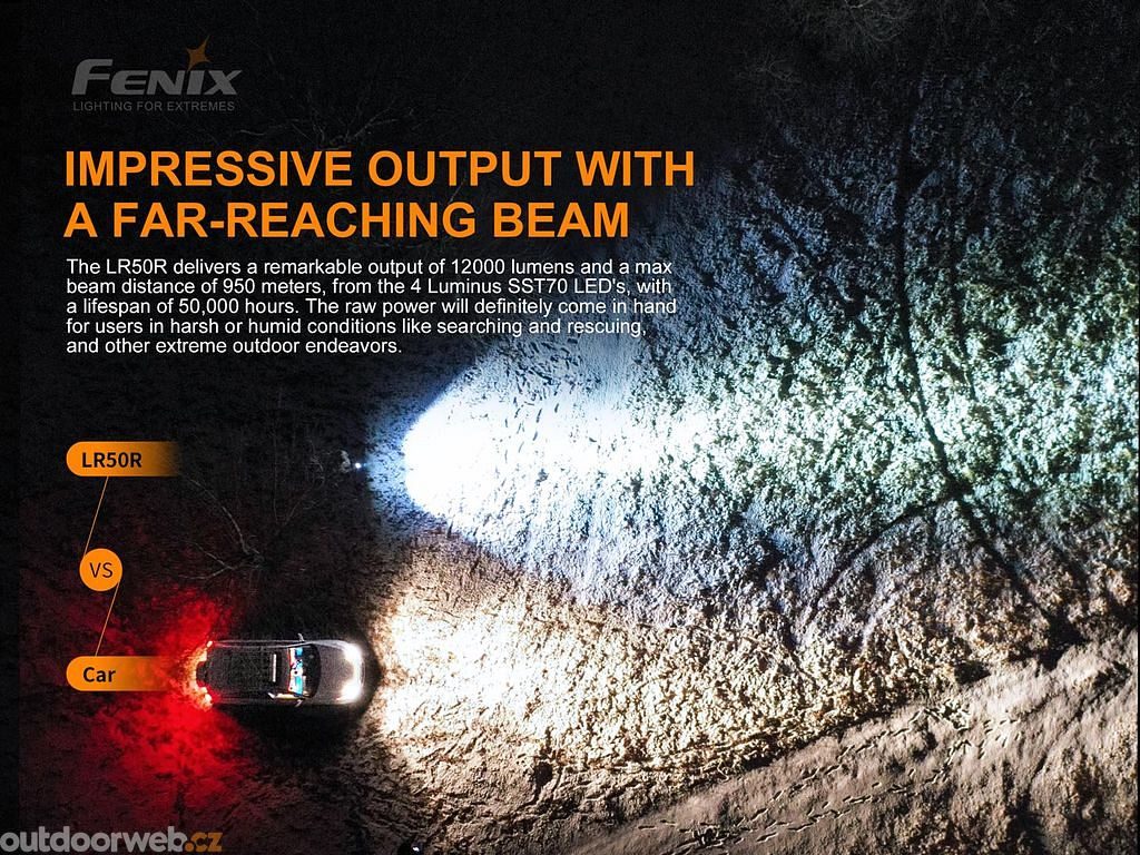Ultra výkonná nabíjecí svítilna Fenix LR50R přináší extrémní světelný tok až 12000 lumenů (ANSI) a dosvit až 950 metrů. Svého výkonu dosahuje pomocí čtyř výkonných LED Luminus SST-70 s životností 50000 hodin svícení, které jsou napájeny z interního vysokoproudového Li-ion akumulátoru s kapacitou 57,6 Wh.
