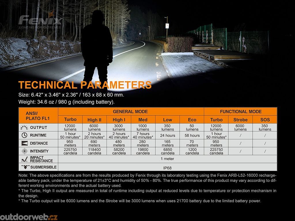 Všechny parametry svítilny (světelný tok, doba provozu na baterie, vodotěsnost, dosvit a nárazuvzdornost) jsou změřeny v souladu s normou ANSI/NEMA FL 1-2009.