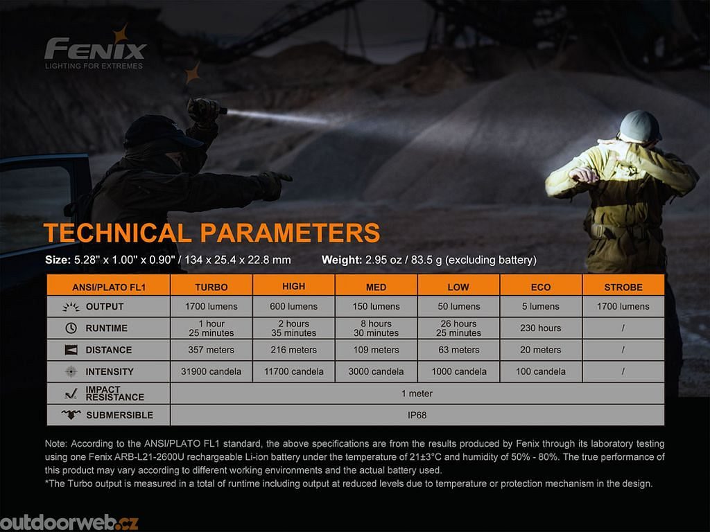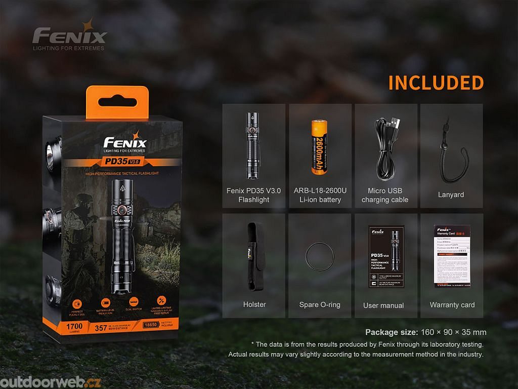 - Světelný tok a časy výdrže jsou měřeny s nabíjecí Li-ion baterií Fenix 18650 s kapacitou 2600mAh (součástí balení).