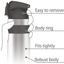 ![]() | V zúžení těla termosky je nasazen protiskluzový kroužek pro jednoduchou manipulaci (body ring). Uzávěr je tvarován pro snadné uchopení a vysunutí z cyklistického držáku. Termosku můžete ovládat pouze jednou rukou. |