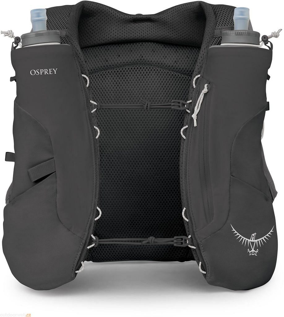 Zadní panel z 360° pružné síťoviny, dvojité hrudní popruhy a promyšlené uchycení lahví drží vestu pevně na místě i při dlouhých bězích.
