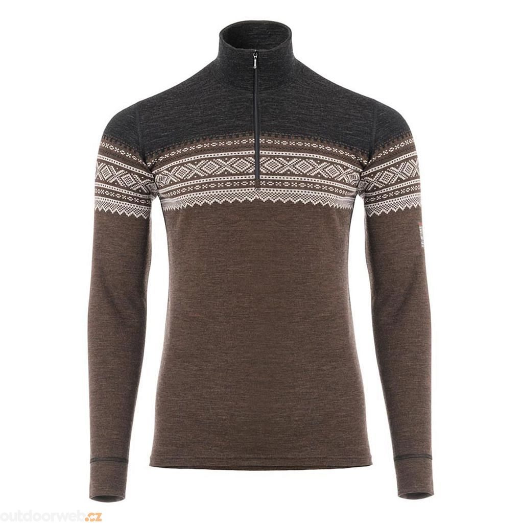 Žakárový úplet s tradičním norským vzorem a praktický zip pro flexibilní nošení.