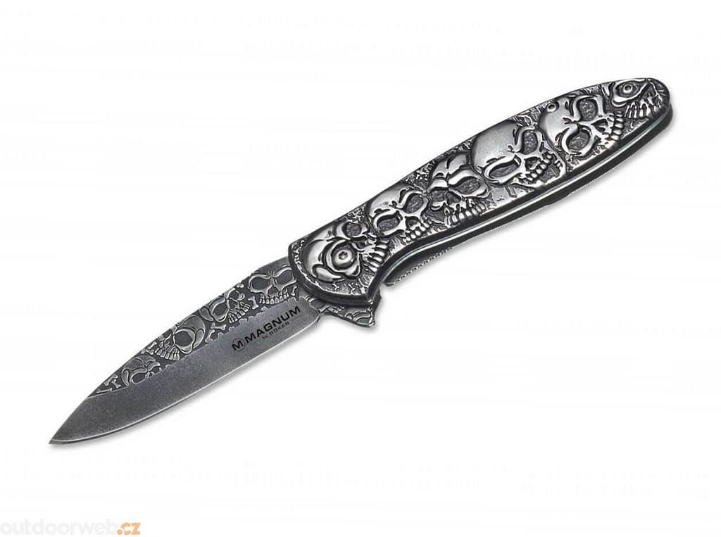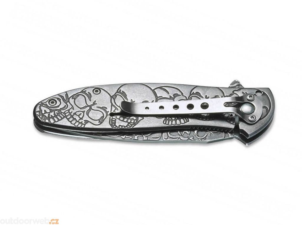 Reliéfní rukojeť dělá lebky neuvěřitelně reálné. Pružinová čepel z nerezové oceli 440 je také zdobena četnými kostmi a lebkami a snadno se otevírá pomocí flipperu. Pojistka Linerlock zajišťuje potřebnou bezpečnost a brání nechtěnému zavření čepele. S klipem pro uchycení.