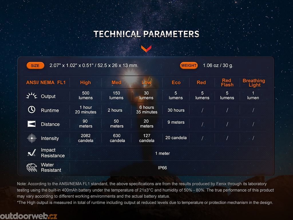 Všechny parametry svítilny (světelný tok, doba provozu na baterie, vodotěsnost, nárazuvzdornost a dosvit) jsou změřeny v souladu s normou ANSI/NEMA FL 1-2009.