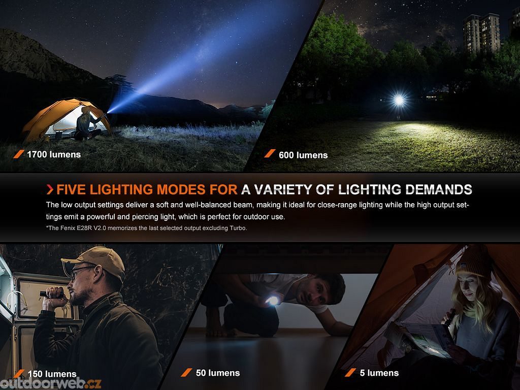 Sedm režimů osvětlení od dlouhodobého svitu po stroboskop, plus indikátor nabití a varovné světlo, činí z E28R V2.0 nezbytného společníka.