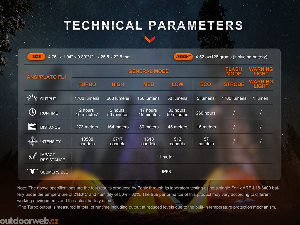 - Světelný tok a časy výdrže jsou měřeny s přibaleným Li-ion 18650 akumulátorem s kapacitou 3400 mAh.