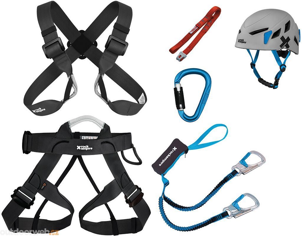 - Celý set: sedací a prsní úvazek, ferratová brzda a přilba