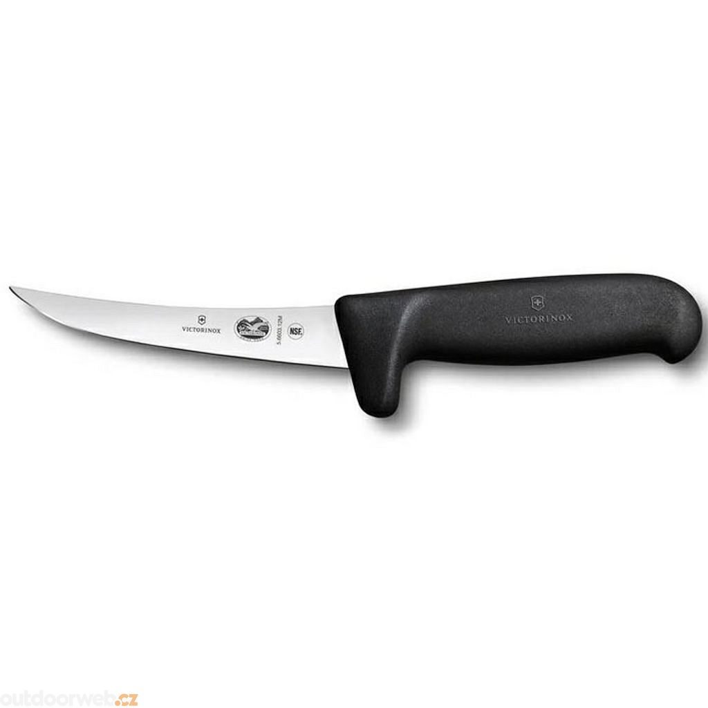 Vykošťovací kuchyňský nůž s 12 cm dlouhou, úzkou a zahnutou čepelí a s ergonomickou a protiskluzovou rukojetí z černého plastu (TPE). Nože Fibrox odolají teplotám do 110°C a lze je umývat v myčce. Vykošťovací kuchyňský nůž s úzkou a zahnutou čepelí Victorinox Fibrox 12 cm s černou plastovou rukojetí.