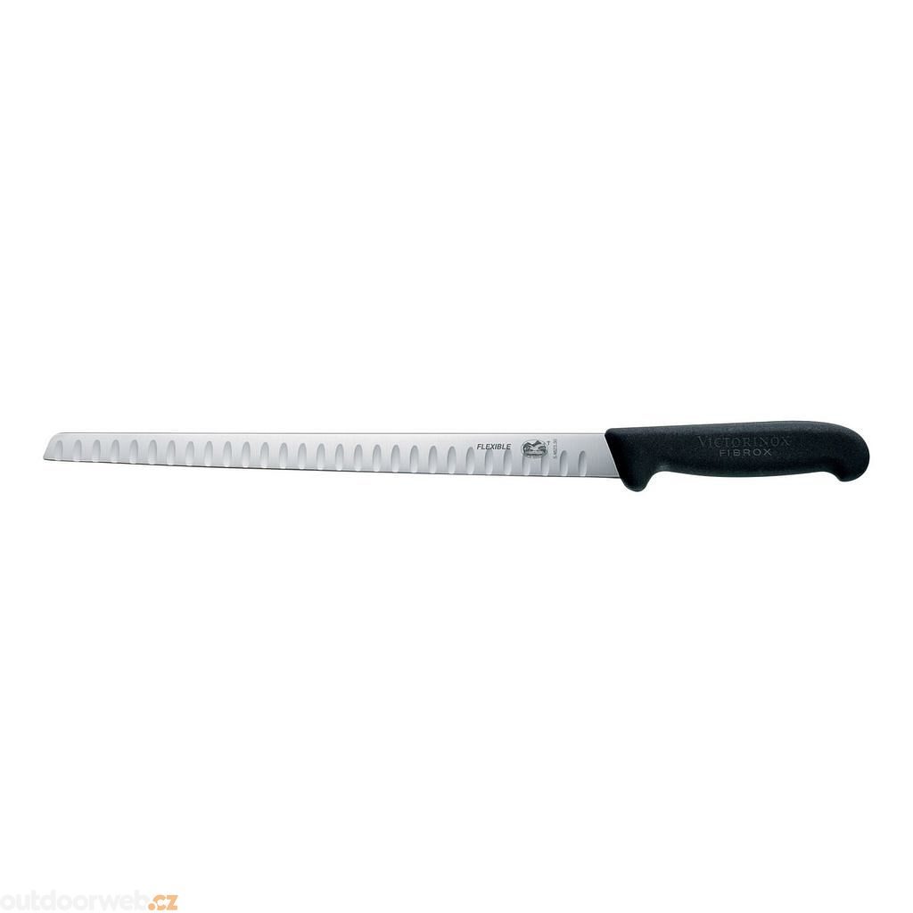 Nůž na lososa Fibrox se švýcarským designem a rýhovaným ostřím je ideální pro jemné krájení a filetování lososa či mastných ryb díky pružné čepeli a protiskluzové ergonomické rukojeti.