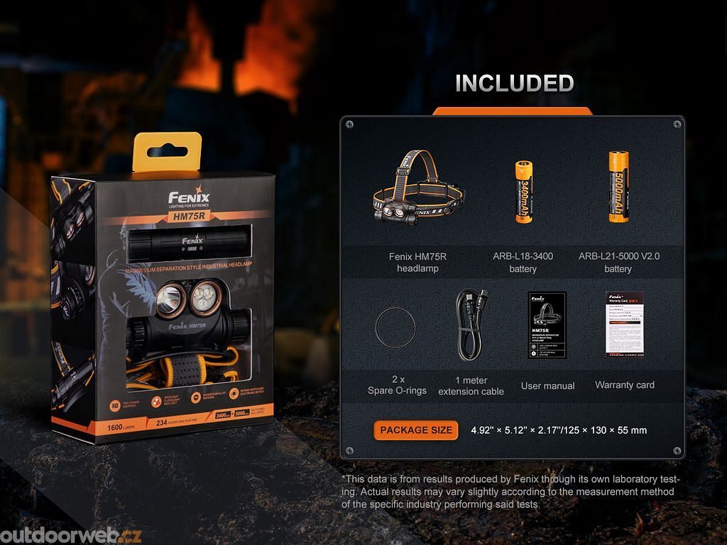 Obsah balení: čelovka, nabíjecí prodlužovací USB-C kabel 1 m, Li-ion akumulátor typu 18650 s kapacitou 3400 mAh, Li-ion akumulátor 21700 s kapacitou 5000 mAh, bateriové pouzdro / powerbanka a náhradní o-kroužky.