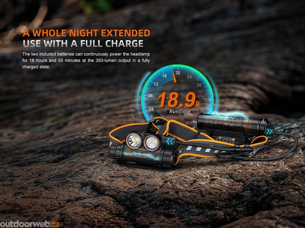 - Používá Li-ion akumulátory 18650 (uvnitř těla čelovky) s kapacitou 3400 mAh a 21700 (v bateriovém pouzdře na zátylku) s kapacitou 5000 mAh (oba součást balení).