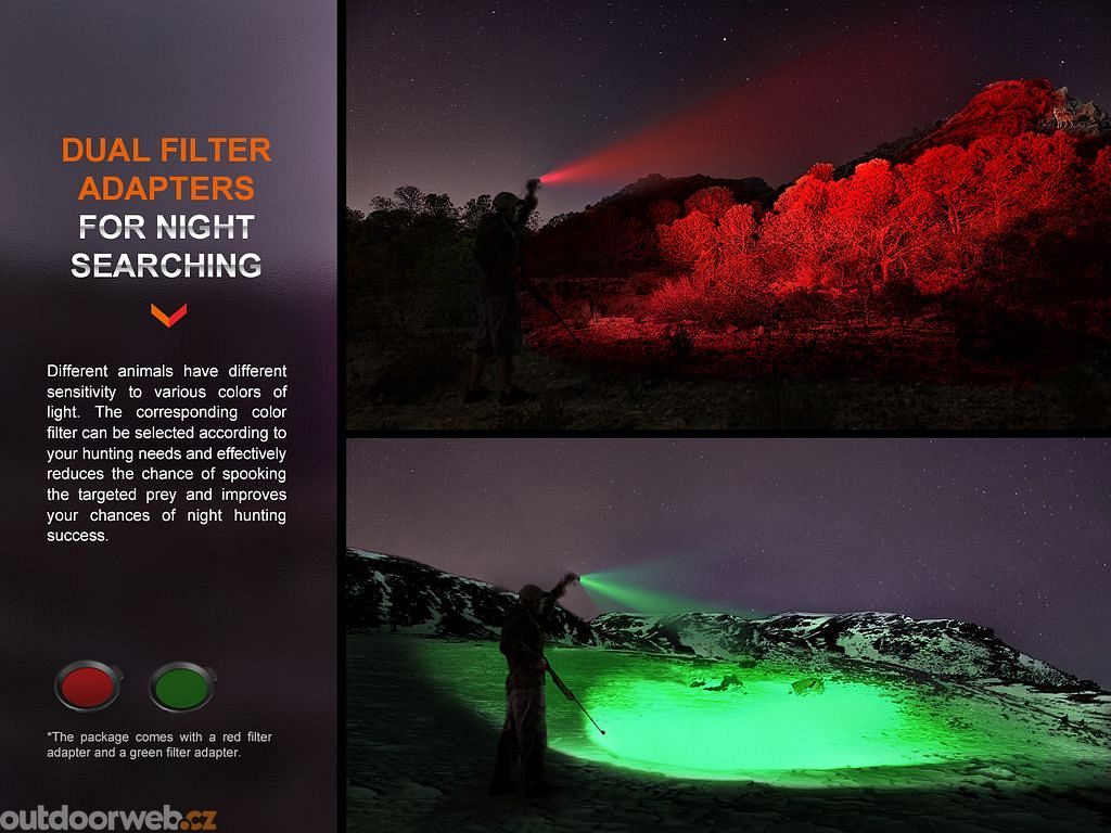 Navíc, taktický duální spínač na zadní straně umožňuje okamžitou aktivaci a okamžitou aktivaci stroboskopu, zatímco červený a zelený filtr v balení rozšiřují vaše možnosti osvětlení. Svítilna je také kompatibilní s montážemi na dlouhou zbraň a kabelovým spínačem Fenix AER-05, což ji činí ideální volbou pro lovce a profesionály.
