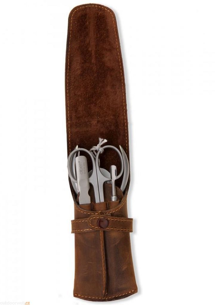 Alpen představuje elegantní manikúrní sadu v koženém pouzdře, nezbytnou pro dokonalou péči o nehty. Tato sada obsahuje čtyři vysoce kvalitní nástroje z nerezové oceli, precizně vyrobené mistry řemesla v Lombardii. Pouzdro se zavíráním na druk zajišťuje bezpečné uložení a snadné přenášení.