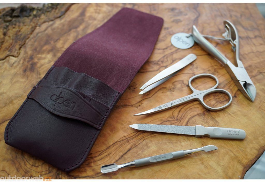 Obsah sady: Nůžky na nehty, kleštičky na kůžičku, pinzeta, pilník, nástroj na čištění a zatlačování kůžičky