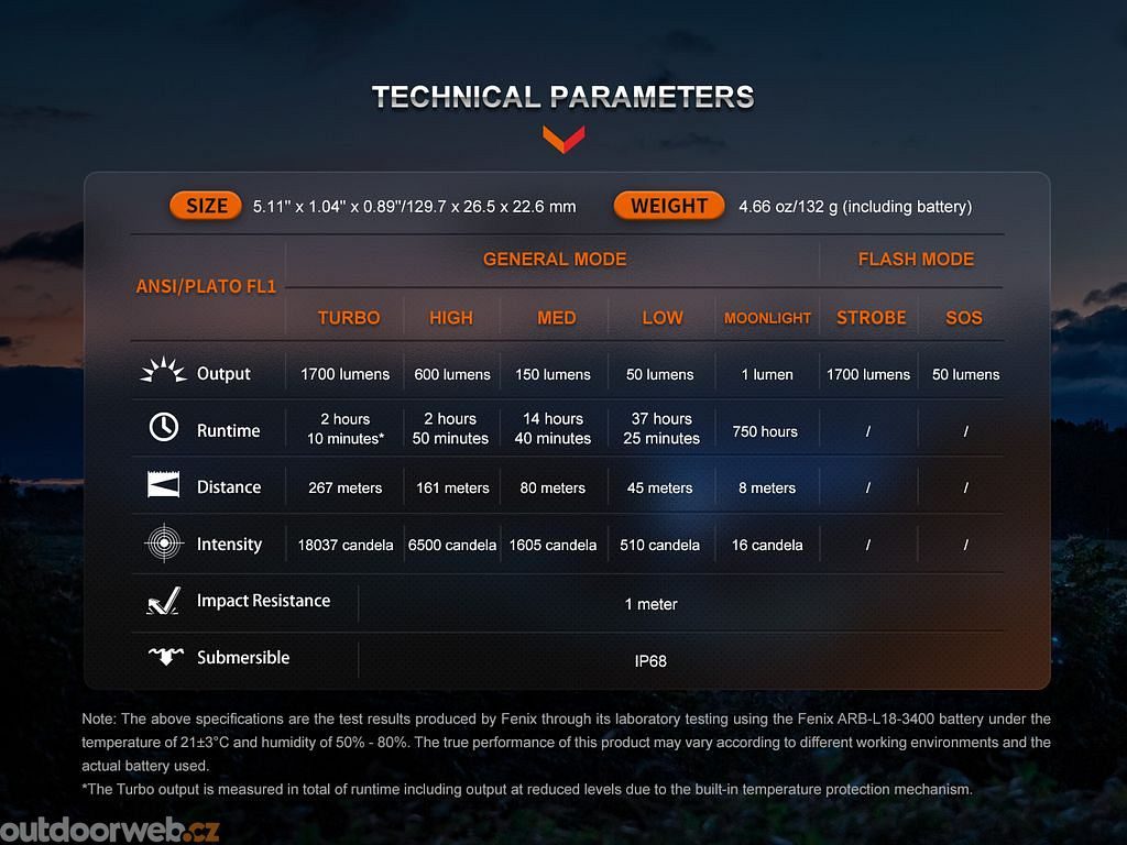 - Světelný tok a časy výdrže jsou měřeny s přibaleným Li-ion 18650 akumulátorem s kapacitou 3400 mAh.