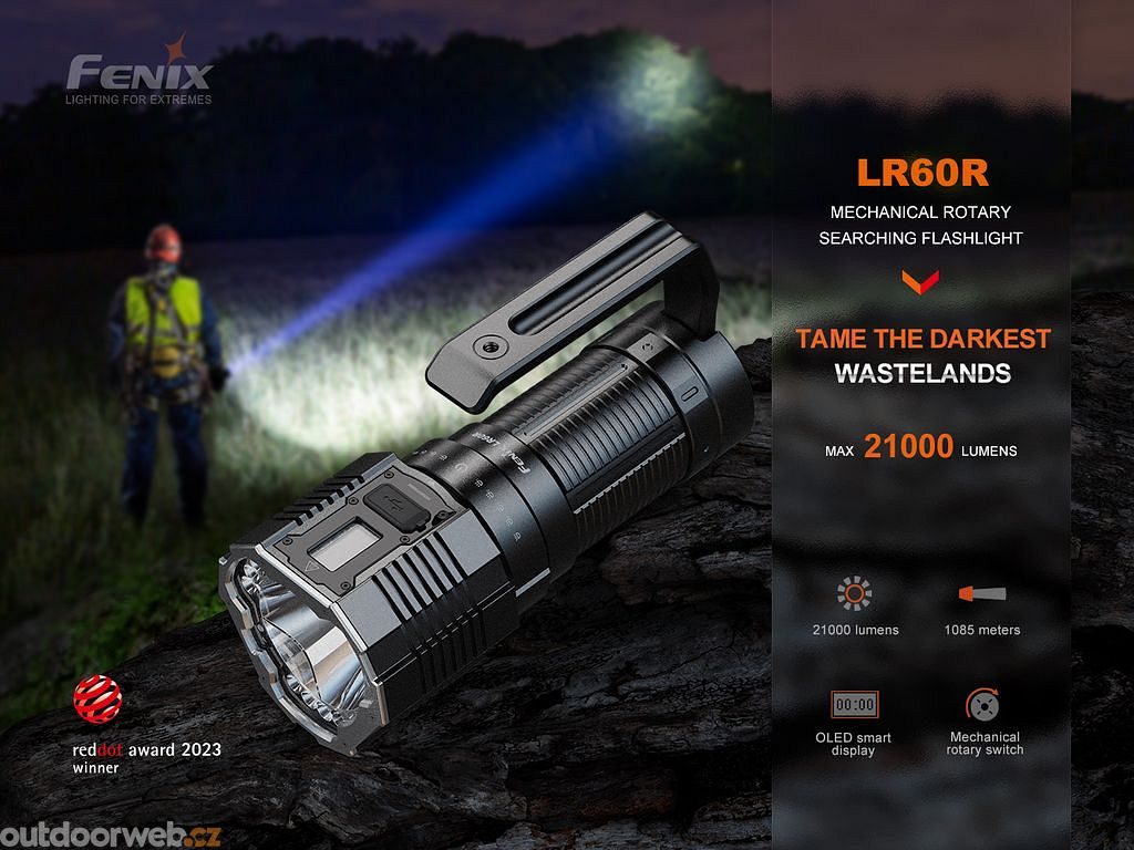 Představujeme vám svítilnu Fenix LR60R, která představuje novou éru v oblasti ultra výkonných svítilen. Tato nabíjecí svítilna vám poskytne až 21000 lumenů světelné síly a dosvit až 1085 metrů, což ji činí ideálním nástrojem pro ostrahu velkých areálů, služební použití, průzkumné a záchranné operace.