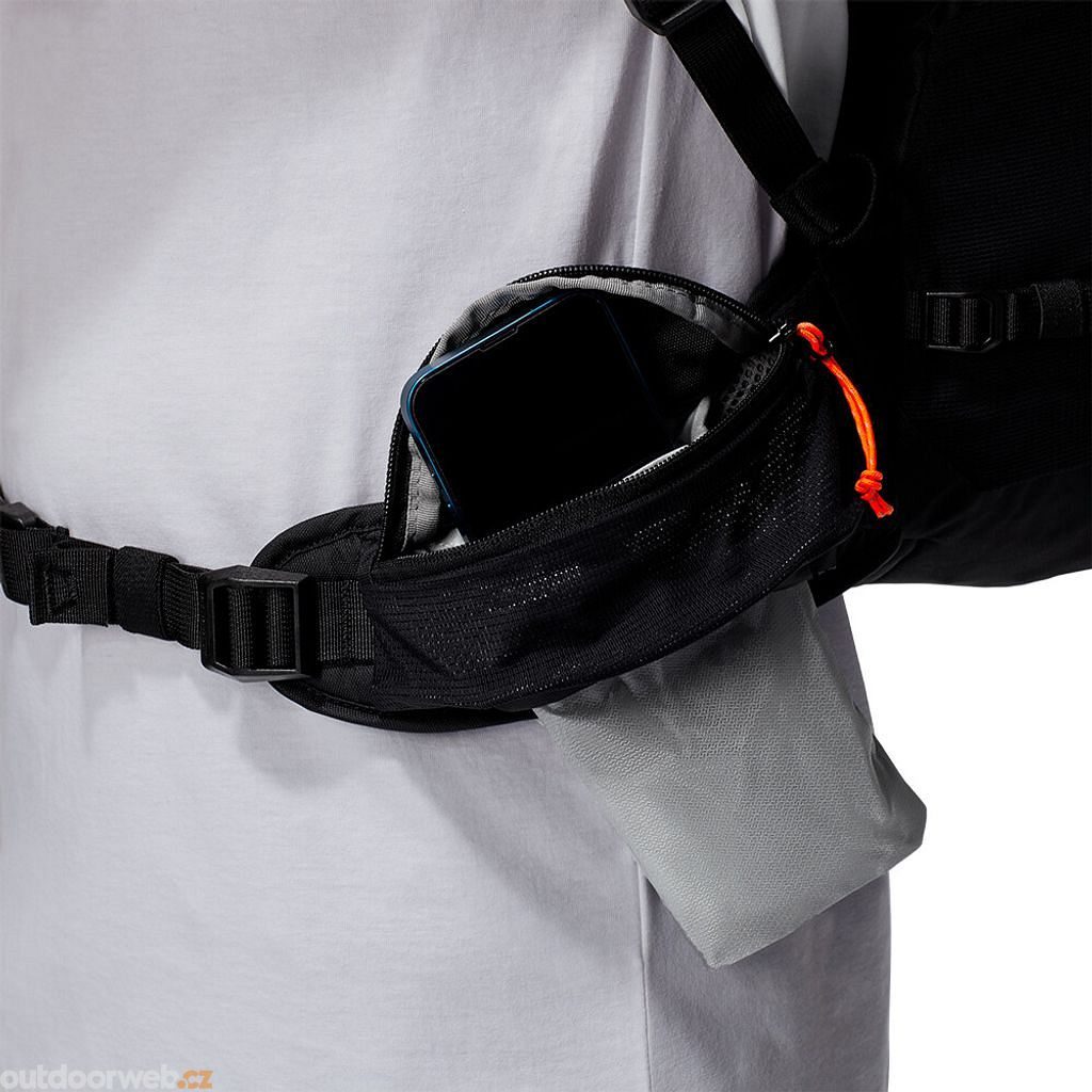 Polstrovaný bederní pás má výklopnou kapsu na chytrý telefon. Pokud ji nepotřebujete, můžete ji jednoduše vyjmout. Totéž platí i pro integrovanou pláštěnku. Batoh je kompatibilní s hydratačními systémy. Boční kapsy ze síťoviny umožňují přístup i při chůzi.
