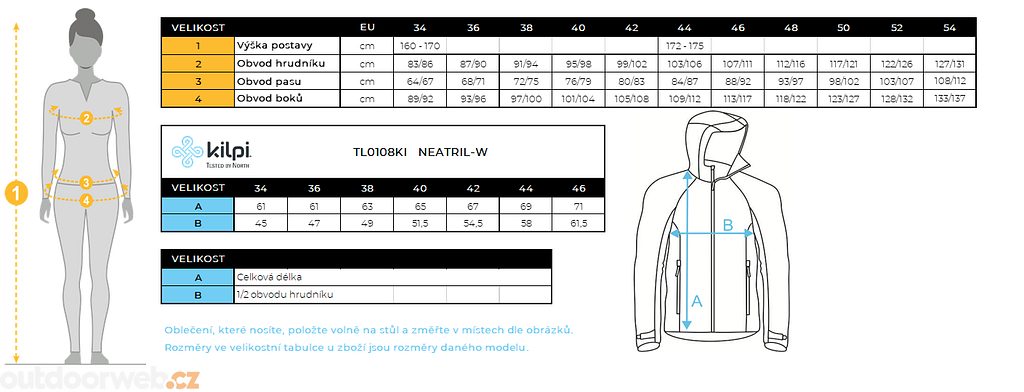 Reflexní prvky umístěny na zádech, rukávech a zipech jsou dobře viditelné ve tmě a šeru. Bunda je vybavena dvěma zipovými kapsami s vnitřní síťovaným váčkem, který lze použít mírným pootevřením jako ventilační otvory. Kilpi NEATRIL-W je v nabídce ve dvou barvách.