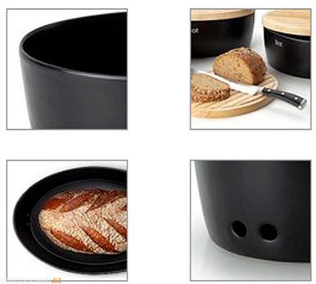 Glazovaná keramická nádoba je vhodná do myčky. Dřevěné víko s vroubkovaným povrchem lze použít jako krájecí prkénko. Součástí jsou vyměnitelné popisky k nalepení. Vhodná pro skladování chleba, pečiva, cibule, česneku či brambor.