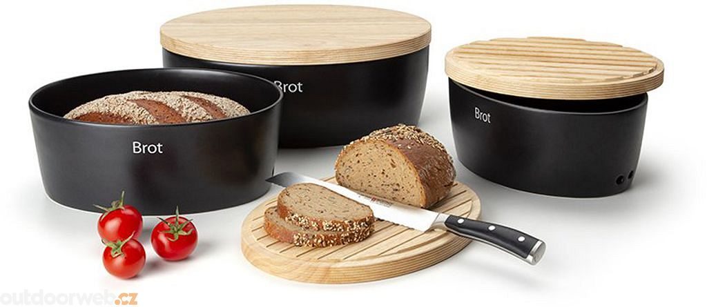 Glazovaná keramická nádoba je vhodná do myčky. Praktické dřevěné víko s vroubkovaným povrchem slouží zároveň jako krájecí prkénko. Součástí jsou nalepovací štítky pro popis obsahu. Ideální pro skladování chleba, pečiva, cibule či brambor.