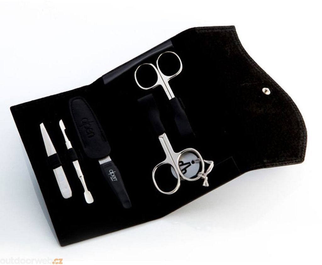 Sada zahrnuje nůžky na nehty, nůžky na kůžičku, pinzetu se šikmým hrotem, pilník a oboustranný nástroj pro čištění nehtů a zatlačování kůžičky.