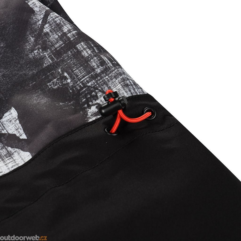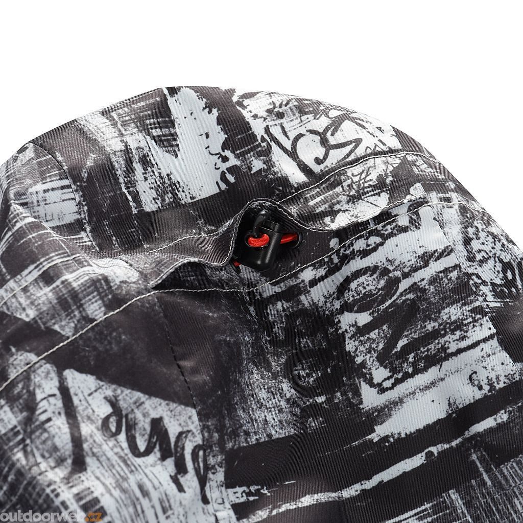 Další funkční vlastnosti zahrnují odvětrávání v podpaží se zipy, sněhový elastický pás a prodlouženou zadní část s regulací šířky na gumičku. Výrazný celopotisk dodává bundě jedinečný vzhled.