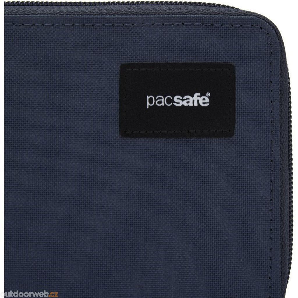 Do lehce přístupné kapsy na zadní straně se ukládají jízdenky. Kovový kroužek slouží k upevnění do Pacsafe zavazadel nebo k připnutí popruhu chráněnému proti proříznutí.