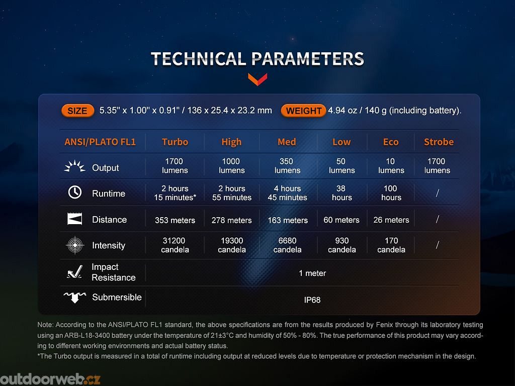 Všechny parametry svítilny (světelný tok, doba provozu na baterie, vodotěsnost, dosvit a nárazuvzdornost) jsou změřeny v souladu s normou ANSI/NEMA FL 1-2009.