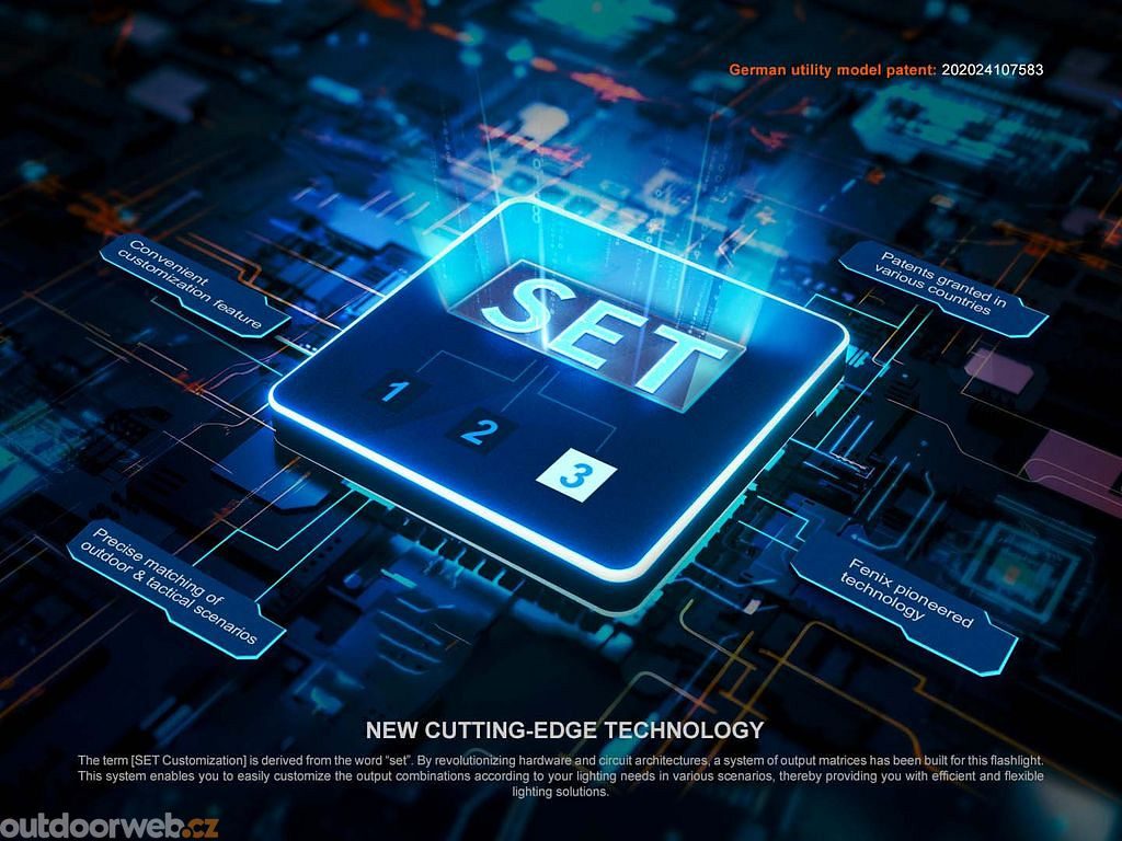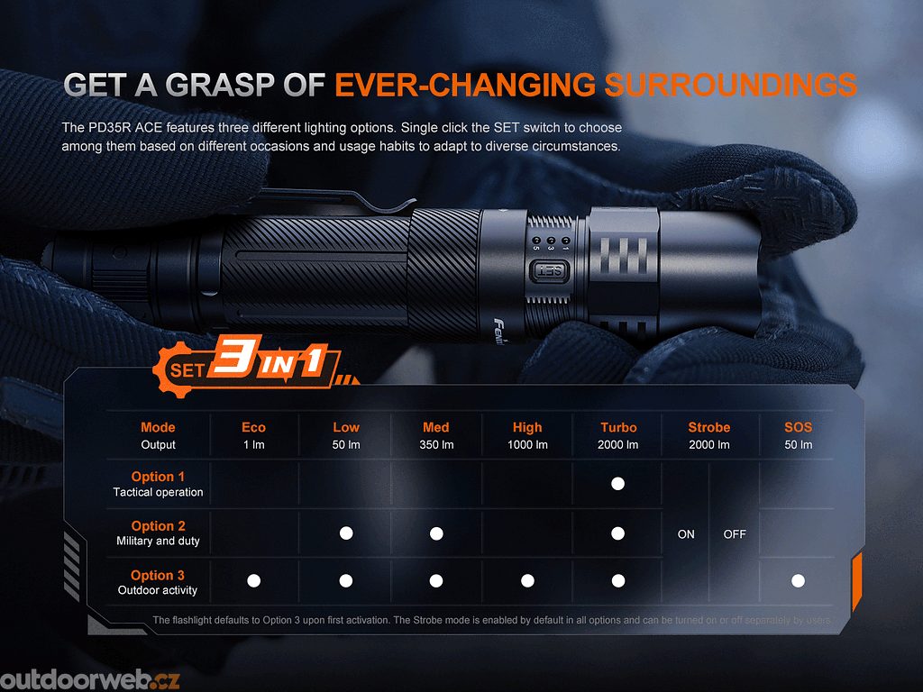 2. Při zapnutém světle stiskem spínače SET přepínáte mezi: Nastavení 1 - taktický mód (jen Turbo režim) → Nastavení 2 - služební mód (3 režimy) → Nastavení 3 - outdoorové aktivity (5 režimů). Při prvním zapnutí svítilny je z výroby vybráno Nastavení 3.