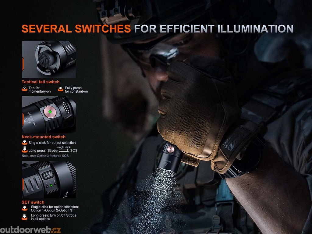 Unikátní programovací tlačítko SET umožňuje zvolit jeden ze tří přednastavených režimů – taktický, služební nebo outdoorový – a přizpůsobit si svítilnu přesně podle svých potřeb. Napájení zajišťuje Li-ion akumulátor 18650 s kapacitou 4000 mAh, který lze pohodlně dobíjet přímo ve svítilně přes USB-C konektor. Robustní konstrukce, vodotěsnost IP68 a taktický koncový spínač podtrhují profesionální charakter této svítilny.