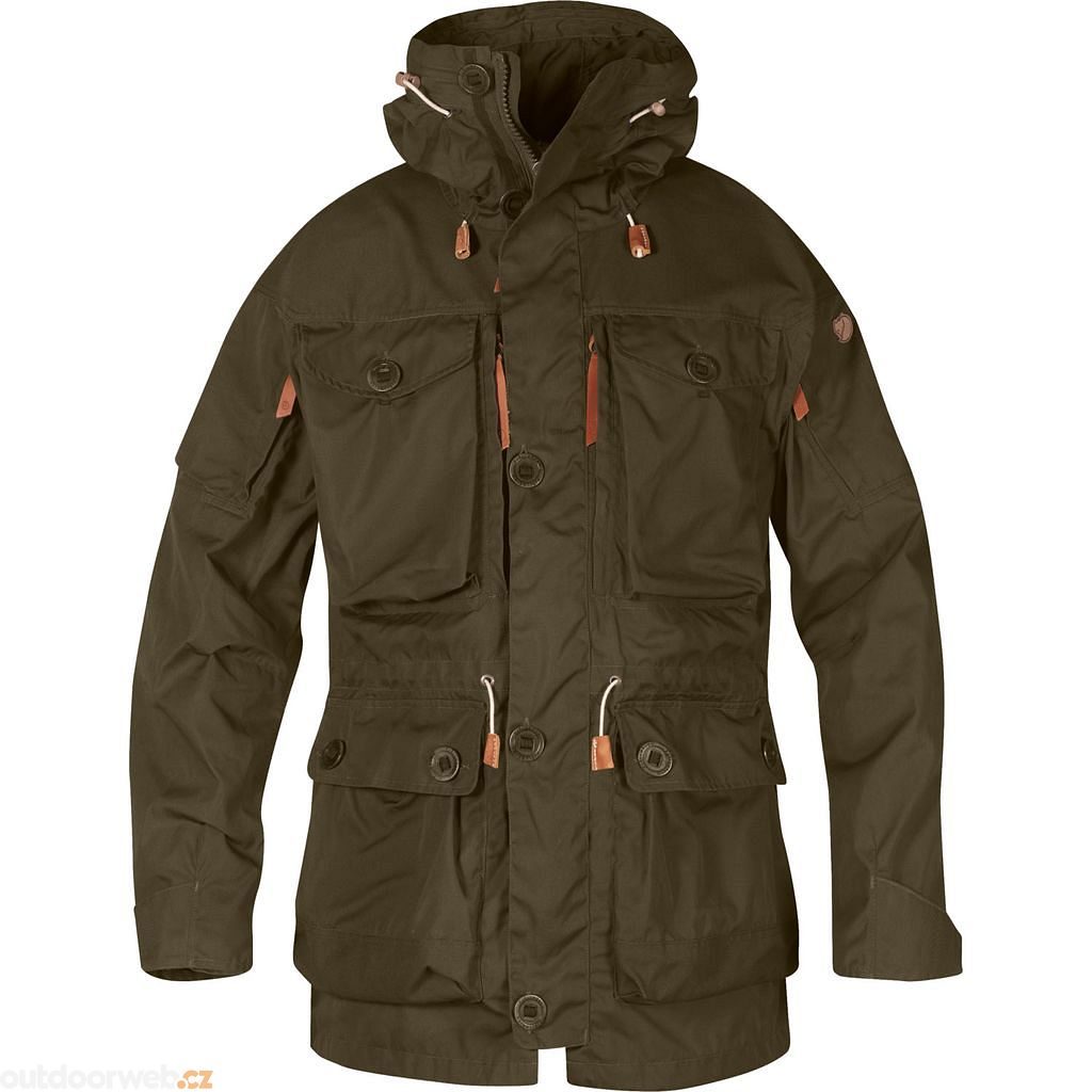Když je kapuce spuštěná, tvoří vysoký límec. Mapy, lékárničky, menší nářadí a další předměty potřebné pro celodenní pobyt v lese lze uložit do mnoha prostorných kapes na hrudi, dole, na zádech a na rukávech. Přední zip je dvoucestný a má ochrannou légu a snadno uchopitelné knoflíky, které jsou k oděvu připevněny šňůrkou.