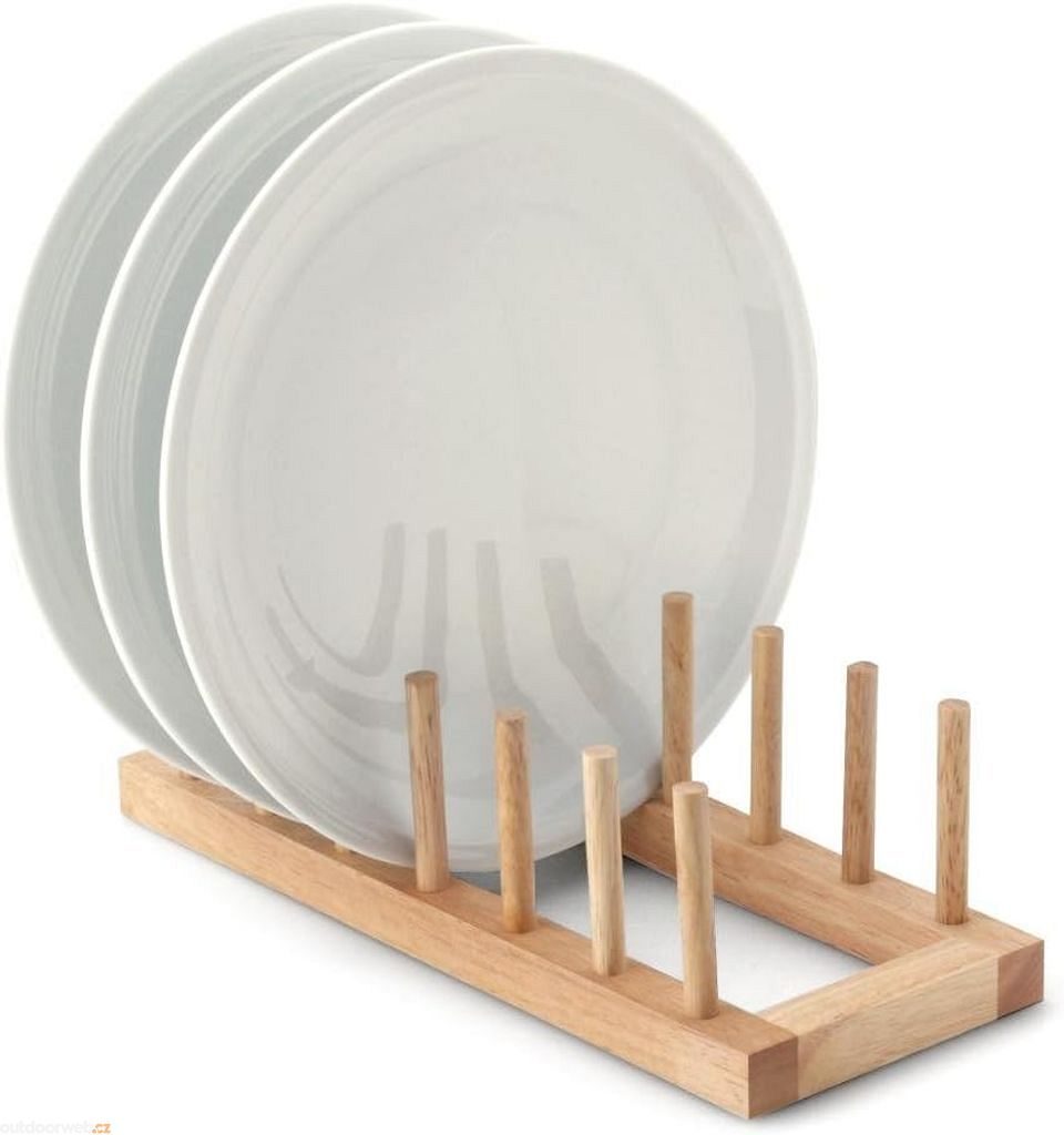 Minimalistický stojan z přírodního dřeva nabízí elegantní řešení pro organizaci jídelních talířů.