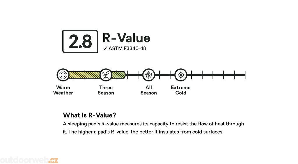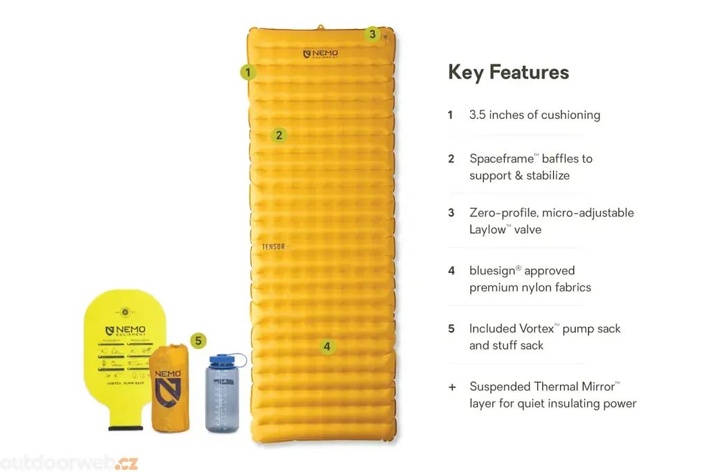 Patentovaný systém Spaceframe™ využívá nízko roztažitelné tkaniny a ultratenkou fólii Thermal Mirror™, která efektivně odráží tělesné teplo, což přispívá k vysoké izolaci a eliminaci nepříjemného šustění během noci. - Lehkost a odolnost pro snadné přenášení i použití