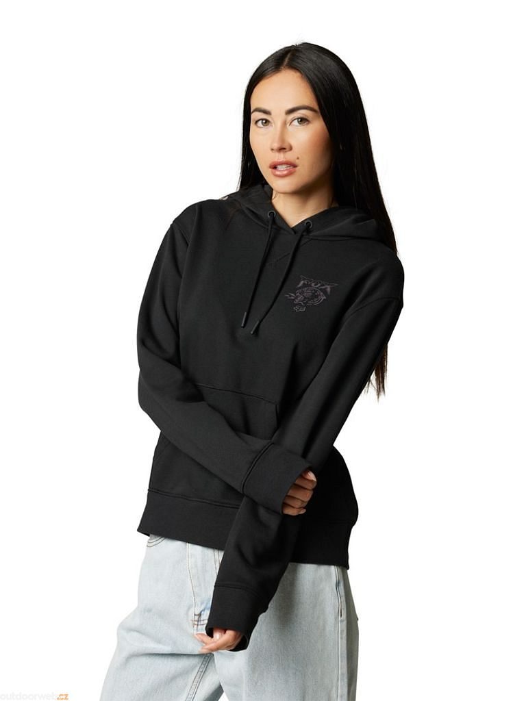 Dámská mikina Fox v rovném střihu v provedení přes hlavu s klasickou přední kapsou a kapucí. Potisk Fox na hrudi a zádech, stahování kapuce tkaničkou, žebrované úplety spodku a rukávů.