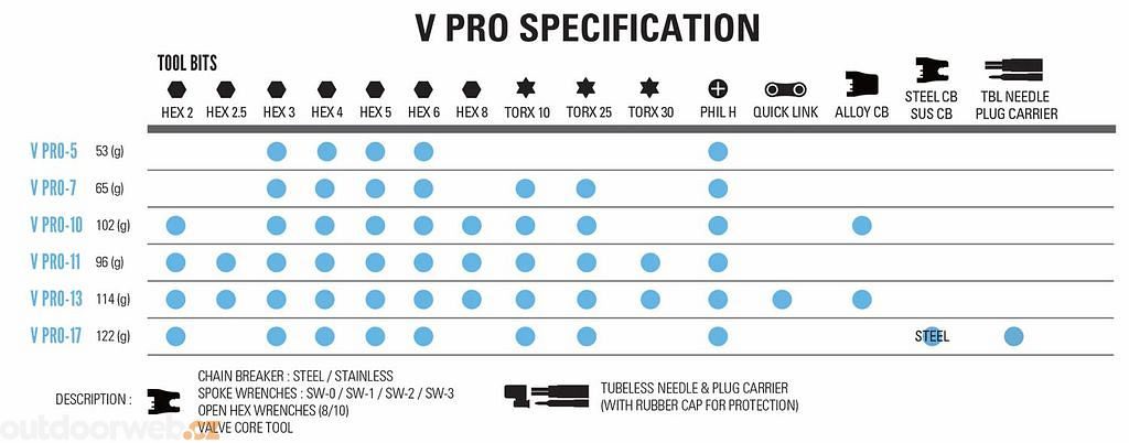 Řada cyklistického multifunkčního nářadí V Pro zahrnuje propracovanou kolekci nářadí vyvinutou pro dnešní moderní jízdní kola. Každý model je navržen a vyroben ve vlastní režii a je určen k efektivním opravám většiny silničních nebo trailových mechanik.