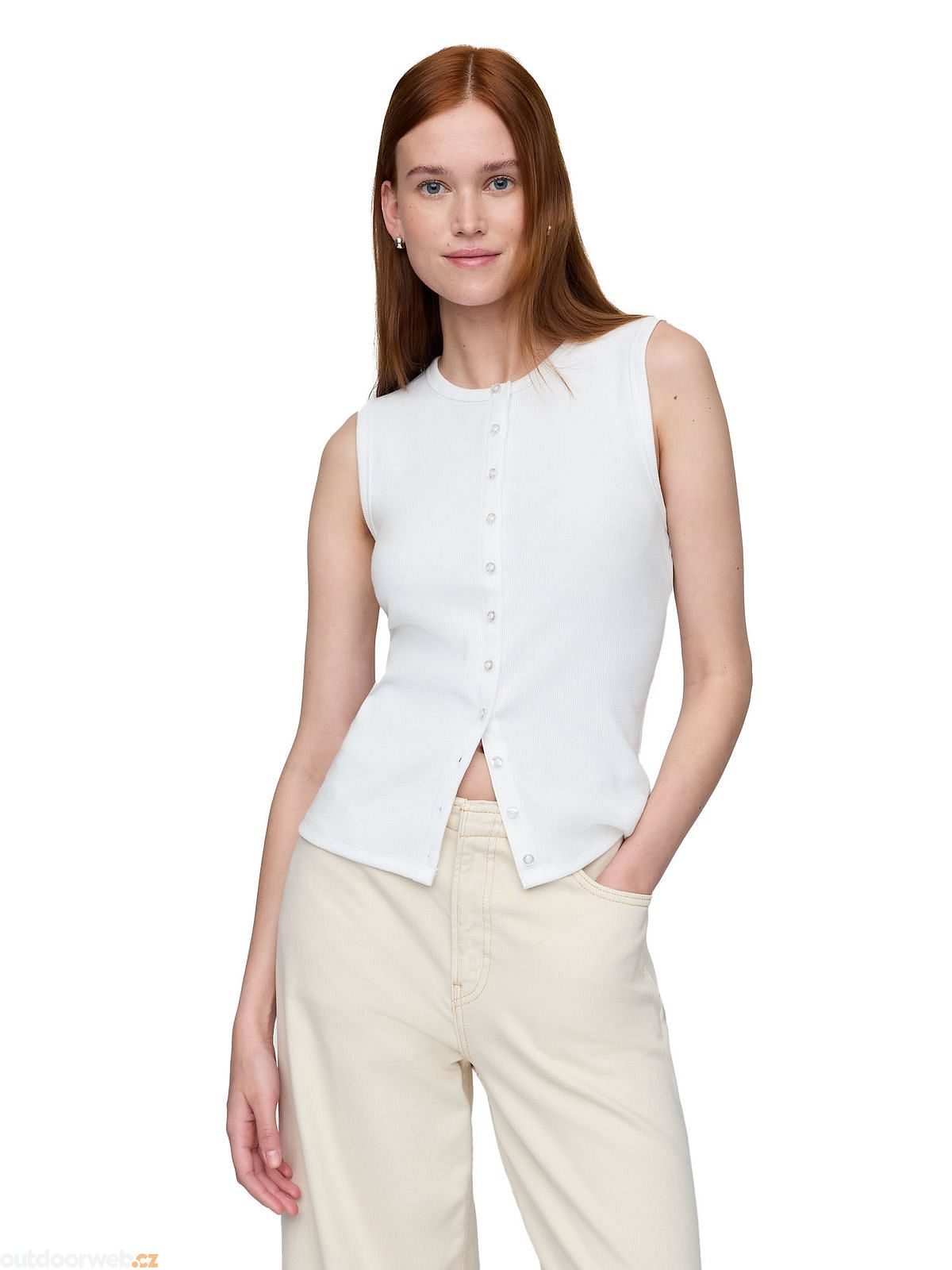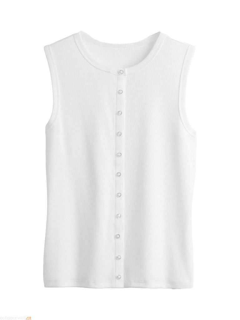 - Kulatý výstřih a absence rukávů dodávají vestě moderní a vzdušný vzhled.